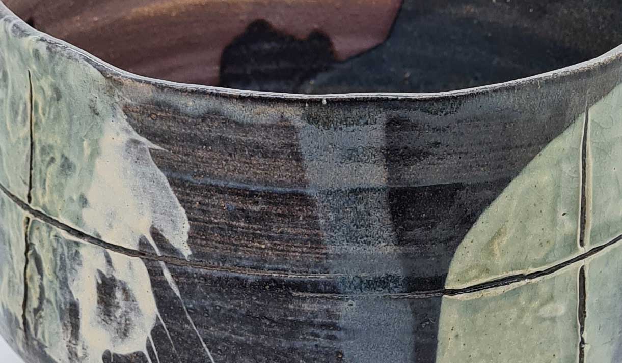 Lloyd works in high-fired stoneware, throwing on the wheel and firing to 1260ºC. Japanese artists such as Ryoji Koie and Ken Matsuzaki influence his fluid and direct style. He alters his work straight after throwing to capture the unexpected and to imbue each form with movement and spontaneity. When glazing he works quickly and deliberately, knowing that that will throw up unique patterns and colours where glazes interract, dribble and run.